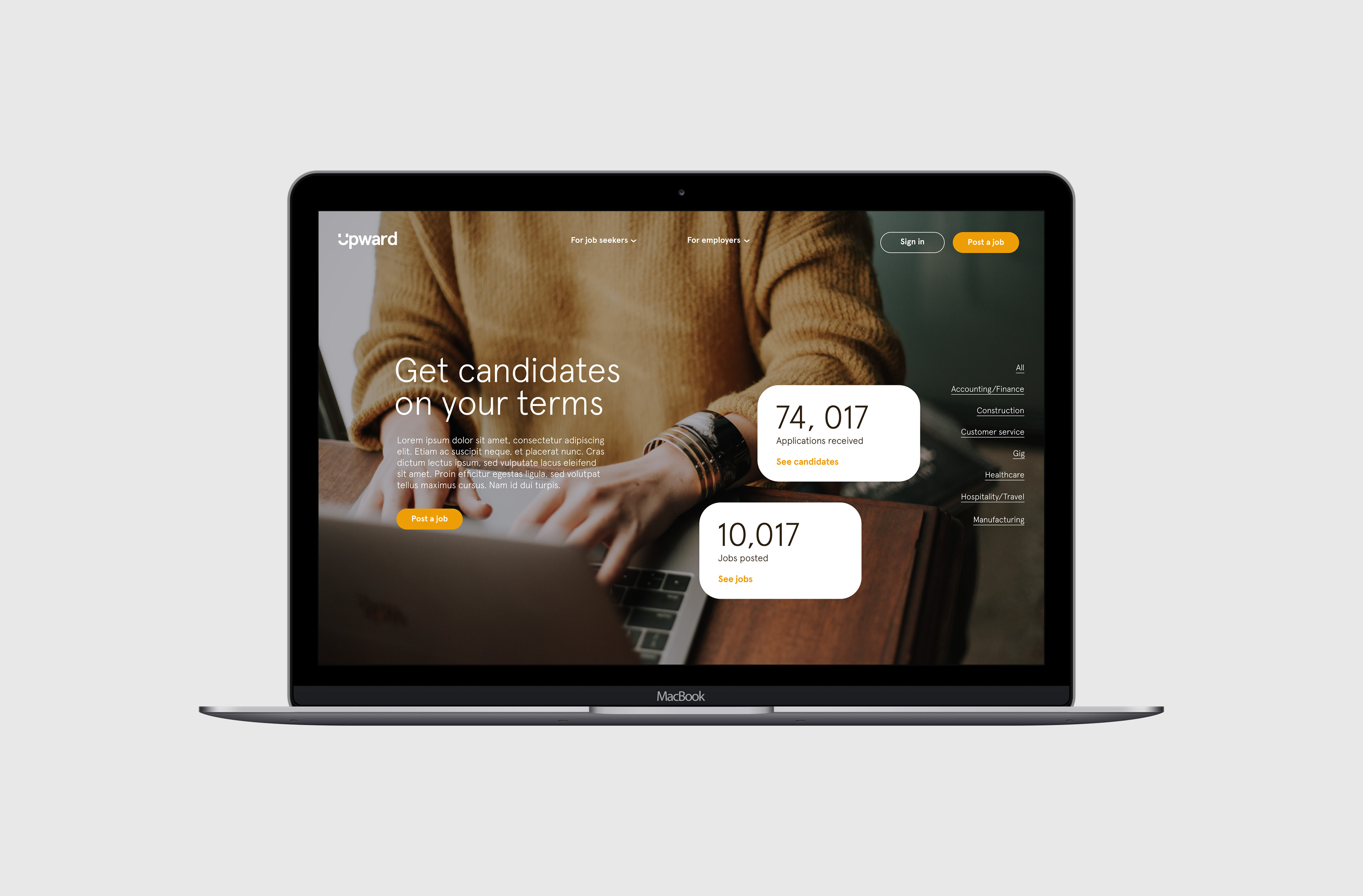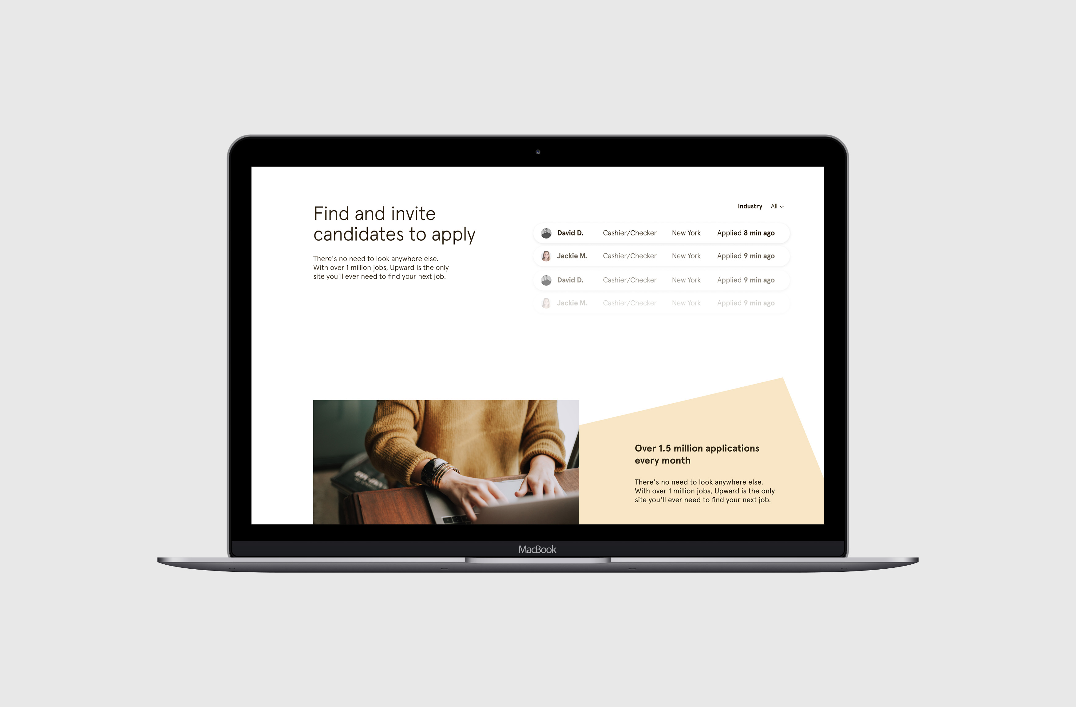 Upward sees themselves as more than a job search platform, but a partner in the employment process. This partnership is based on providing tools to businesses that help solve the perennial challenge of hiring the right people. More than an algorithm that spits out search results, Upward is valued by their customers for the “human advantage” that compliments their enterprise software—a truth CEO Brian Hom wanted to emphasize in the company’s brand identity. Beck & Stone was brought on to bring this emphasis into reality.